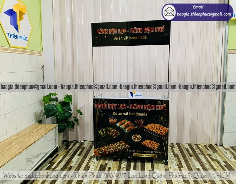 Tên sản phẩm: Thiết kế kệ bán bánh dạo xếp gọn lắp ráp trên hè phố có logo nhãn BÁNH BỘT LỌC, BÁNH NẬM HUẾ