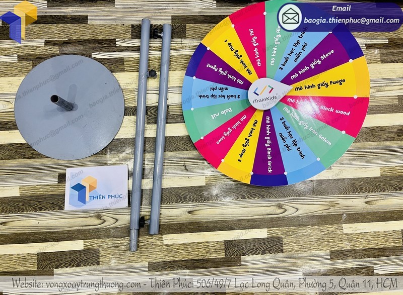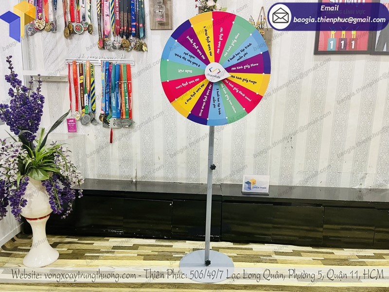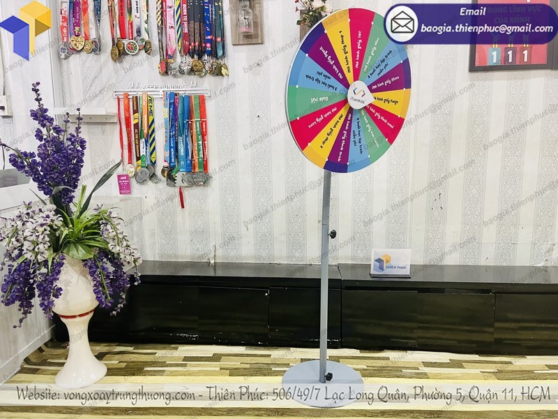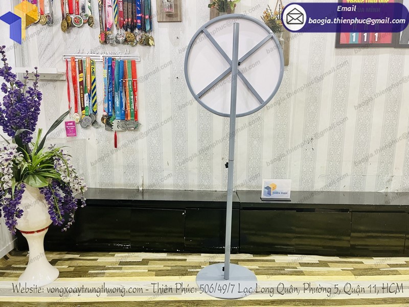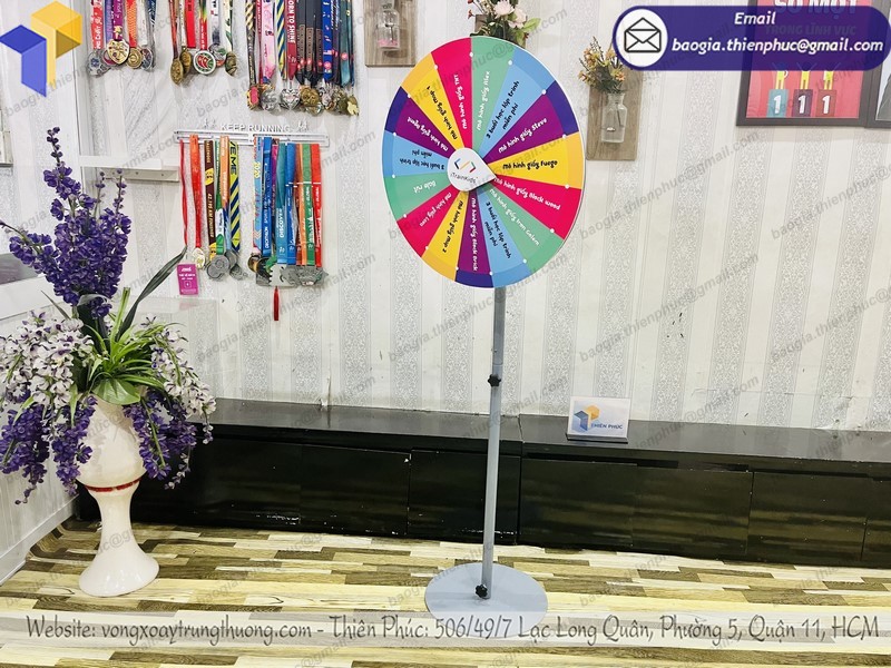 vòng quay trúng thưởng mặt được làm bằng tấm fomex như trò chơi chiếc nón kỳ diệu. vòng quay trúng thưởng chân đứng dùng trong số chương trình game show, trong các sự kiện bốc thăm trúng thưởng, dịp khai trương của hàng, ngày lễ 8/3, 20/10 lễ tình nhân; marketing pr sản phẩm mới, các chương trình quay số trúng thưởng, quảng cáo khuyến mãi quà tặng ...
