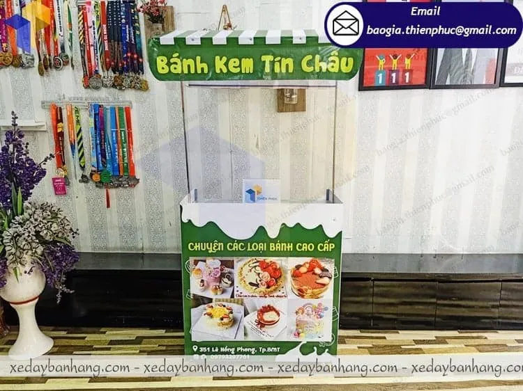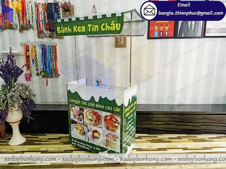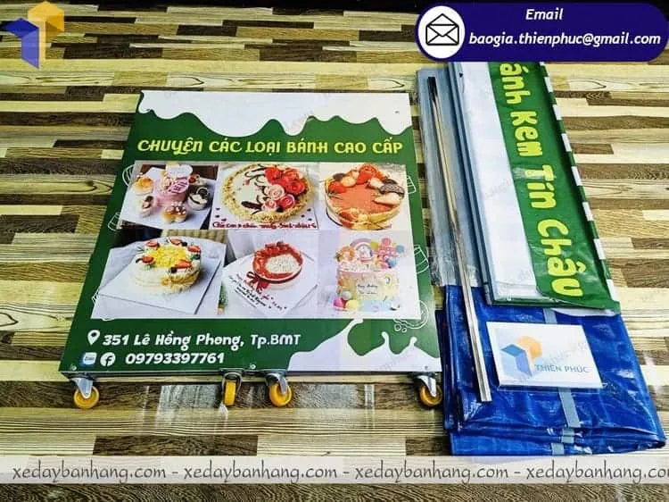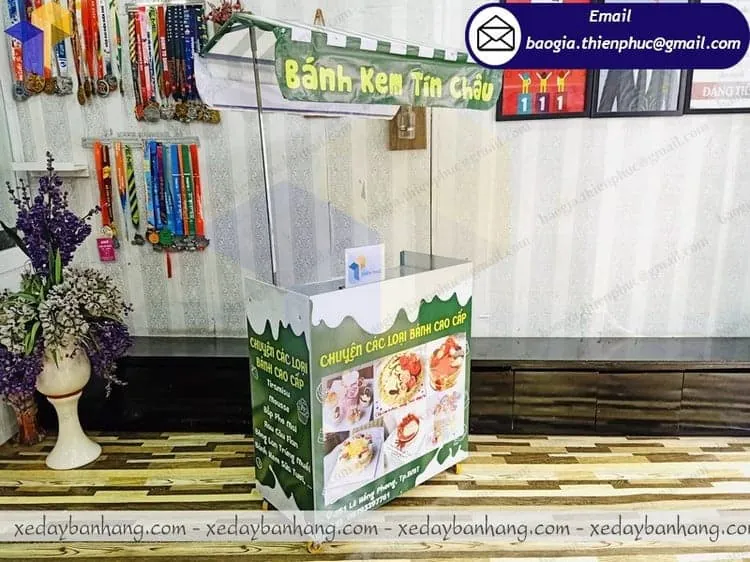 Chỉ với số tiền nho nhỏ 1300000 đồng bạn đã có thể dễ dàng pr cho tiệm bánh của mình qua các con đường lớn nhỏ ở thành phố, toàn bộ khung xe được thiết kế chắc chắn bằng sắt vuông 14mm mạ kẽm chống rỉ sét dưới tác động khắc nghiệt của thời tiết. Xung quanh xe bán hàng lắp ráp được trang trí và thiết kế hoàn toàn theo ý tưởng của bạn và được in sắc nét đánh bật thương hiệu và mặt hàng kinh doanh của bạn. Phần mái che với kích thước Ngang 100 cm x Cao 30cm được trang bị thêm để bảo vệ quầy hàng của bạn khỏi nắng mưa.