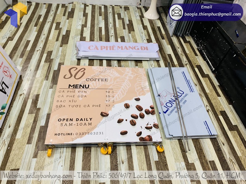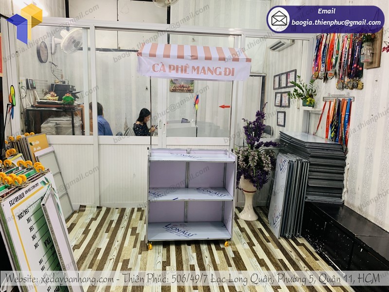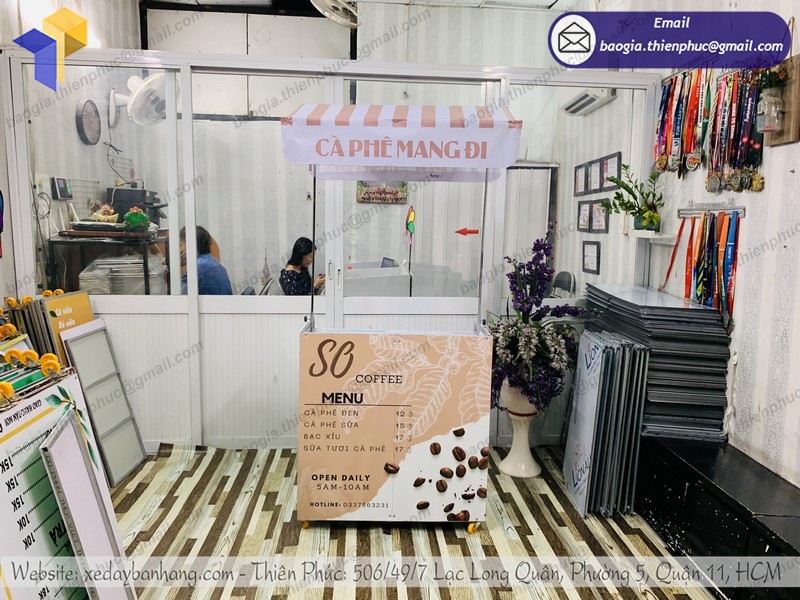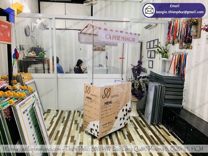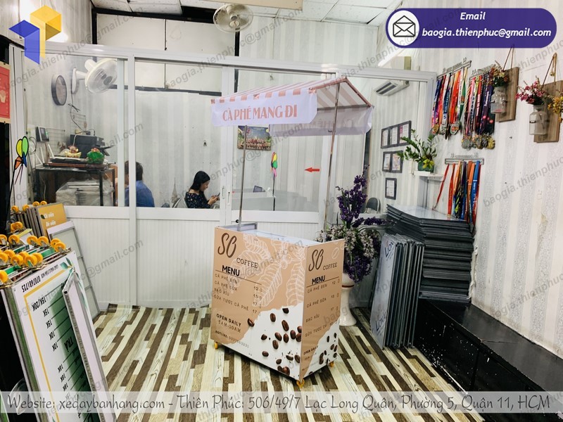 xe gấp gọn bán cà phê lưu động tại Thiên Phúc chúng tôi thường có thiết kế rất đẹp mắt, được in ấn sản phẩm, tên của các thương hiệu trực tiếp lên quầy giúp cho quý khách hàng dễ dàng nhận diện được thương hiệu từ xa. Được sản xuất bằng chất liệu nhựa dẻo đạt 100% không pha có thể tháo lắp dễ dàng và trưng bày tại các siêu thị hoặc các gian hàng hội chợ triển lãm hay bán hàng vỉa hè, bắt mắt mà tiết kiệm khá nhiều chi phí.