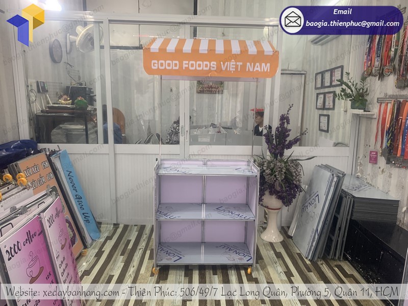 - Xe đẩy gọn nhẹ, trưng bày và đựng nhiều đồ đạc buôn bán tiện lợi, không cồng kềnh, dễ dàng thao tác sử dụng.
