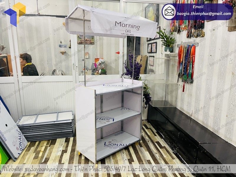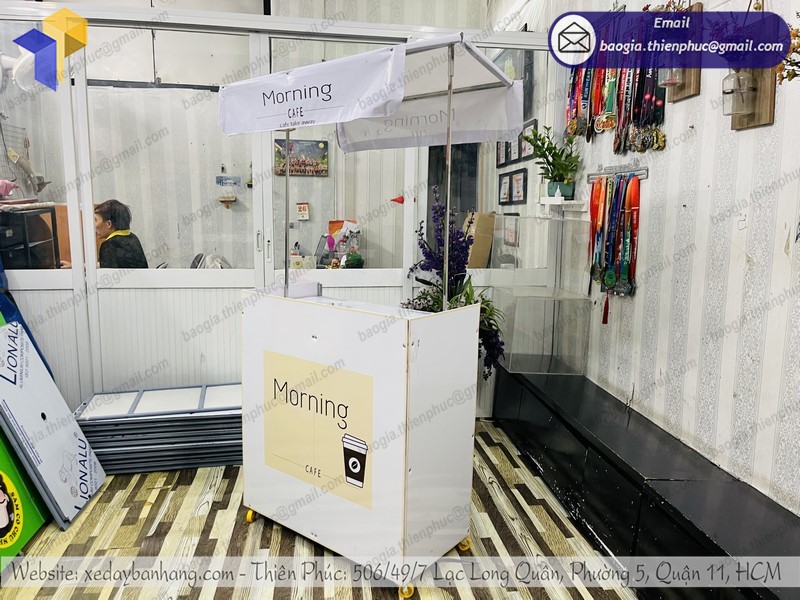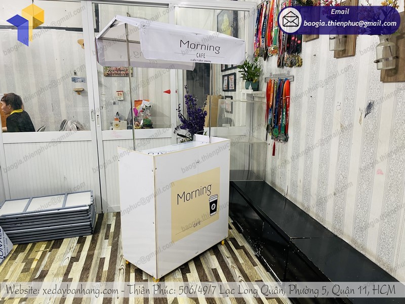 Ở Thiên Phúc chúng tôi có trên ba ngàn mẫu quầy bán café với kích thước và kiểu dáng khác nhau cho bạn nhiều sự lựa chọn. Những loại quầy bán cà phê lớn hơn sẽ cần nhiều nguyên liệu gia công hơn. Đồng thời, việc chế tạo các chi tiết cũng phức tạp và đòi hỏi thời gian lâu hơn. Do đó, kích thước xe đẩy càng lớn thì càng tốn nhiều chi phí.Với mẫu quầy bán cà phê mang đi của Thiên Phúc có ba kích thước chính là 60cm, 80cm và 1m. về có bản chúng đều làm từ chất liệu và kiểu dáng giống nhau chỉ khác nhau về kích thước. Mỗi loại có mức giá khác nhau và dao động chỉ từ 900 – 1500k