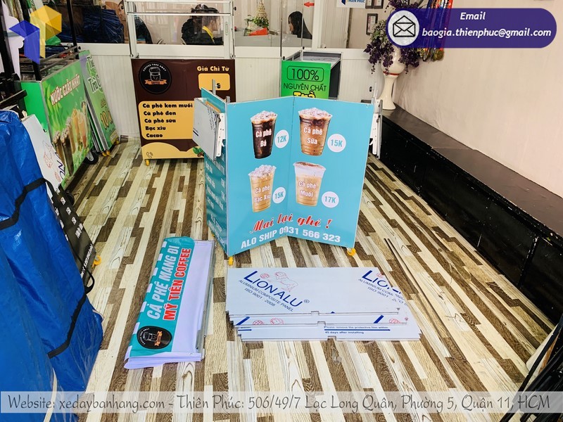 - Xe xếp gọn bán cà phê chi phí rẻ, thiết kế nhỏ gọn, dễ dàng tháo lắp và cất gọn. Có thể tái sử dụng nhiều lần qua mỗi chiến dịch quảng cáo hoặc ra mắt sản phẩm mới của doanh nghiệp.