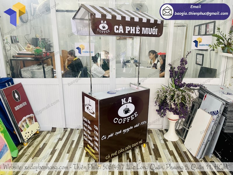 Xe bán café mang đi đang được bán tại website và các cửa hàng của Thiên Phúc với mức giá từ 1.500.000 vnd. So với mặt bằng chung thì đây được xem là mức giá khá là rẻ. Sở dĩ các sản phẩm xe cà phê xếp m của Thiên Phúc có mức giá thấp hơn so với những cửa hàng, đơn vị kinh doanh khác là bởi Thiên Phúc vừa là xưởng sản xuất, trực tiếp gia công các thiết bị, sau đó mang đến tận tay người tiêu dùng mà không qua bất kỳ một đơn vị trung gian nào.