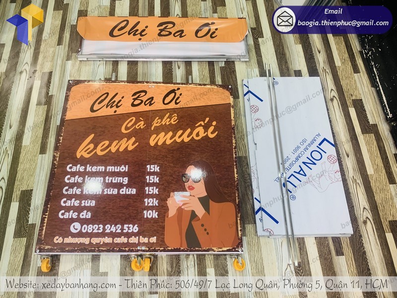 Vì vậy hãy trang trí decal thật bắt mắt, thu hút cho chiếc xe bán hàng của mình. Bạn có thể in sẵn thực đơn lên trên xe cho khách hàng tha hồ chọn lựa. Hãy trang bị một chiếc xe cafe take away thậtthu hút, bắt mắt. Bên trong kệ kính hãy sắp xếp các nguyên vật liệu pha chế cà phê để đánh thức vị giác của thực khách