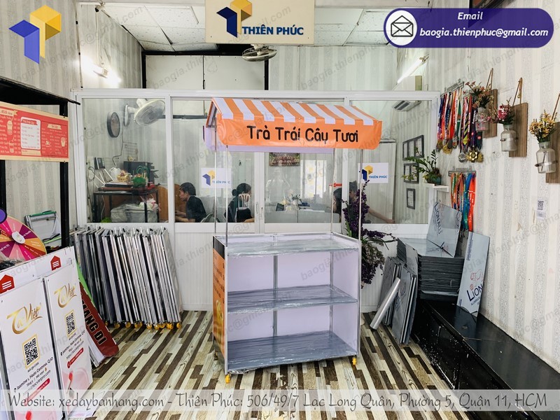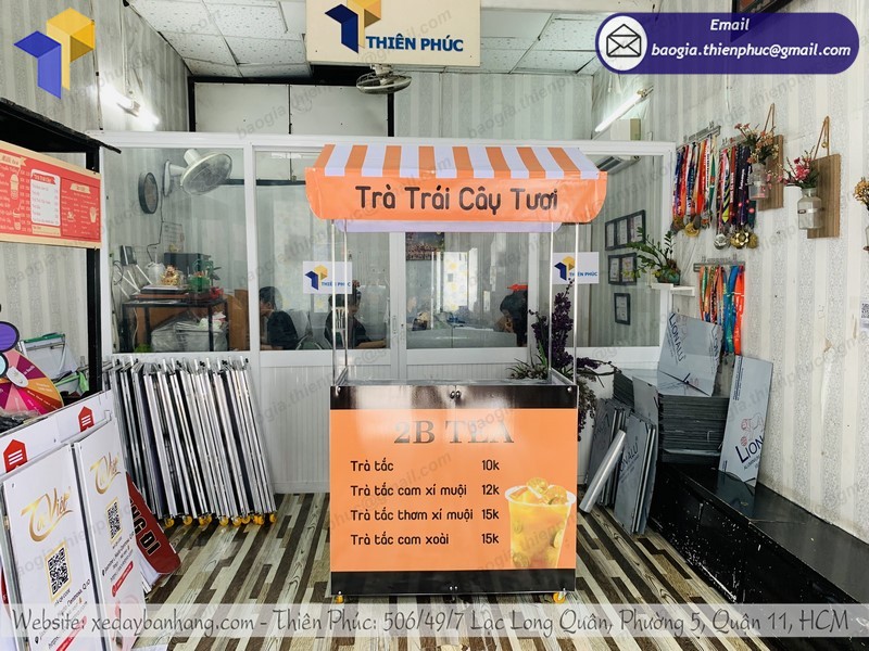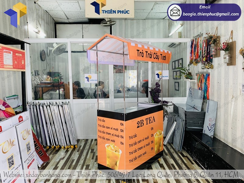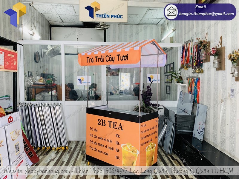 Tại Thiên Phúc có các mẫu xe bán trà trái cây đẹp với kích thước đa dạng. Khách mua hàng sẽ đặt mua trực tiếp tại xưởng. Sản phẩm không qua phân phối trung gian nên giá bán tủ quầy bán trà trái cây vỉa hè luôn tốt nhất. Mặt khác với những ý tưởng thiết kế của khách hàng, hãy trao đổi trực tiếp với đội ngũ thiết kế để làm nên chiếc xe đẩy di động ưng ý nhất.