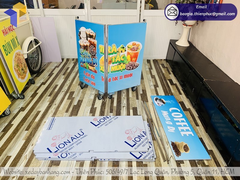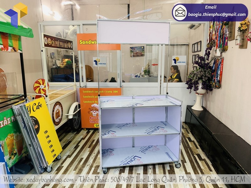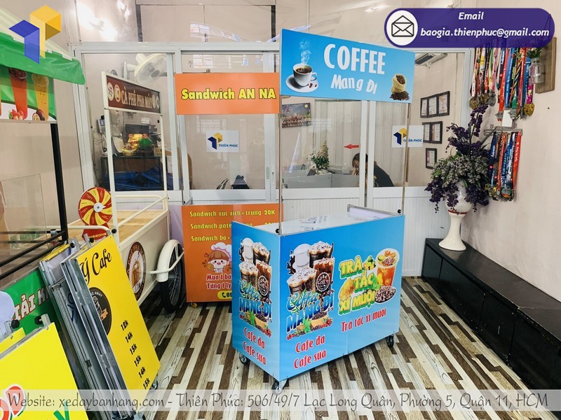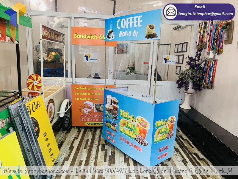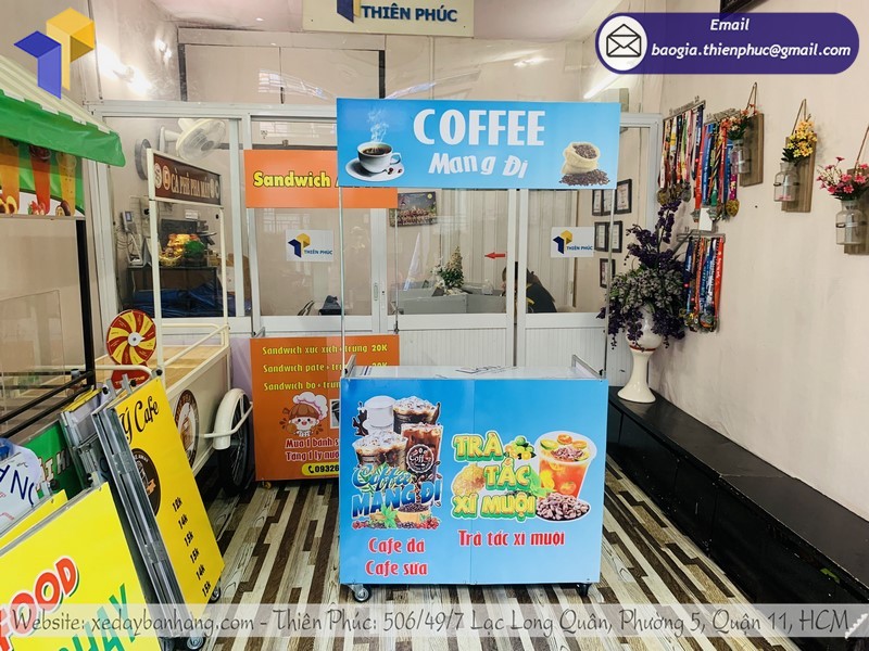 Công ty thiết kế và thi công quảng cáo Thiên Phúc chuyên sản xuất và phân phối xe lắp ráp bán cà phê lưu động với nhiều mẫu mã đẹp mắt. Ngoài xe đẩy, còn có kiot bán hàng, xe đạp bán hàng lưu động, quầy xe lắp ráp và phụ kiện quảng cáo, tủ kiếng,..
