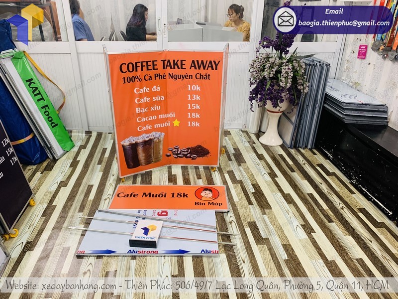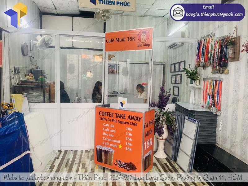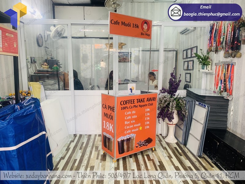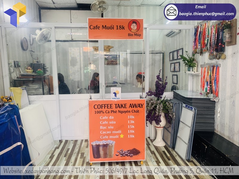 - xe cà phê mini gấp gọn chi phí rẻ, thiết kế nhỏ gọn, dễ dàng tháo lắp và cất gọn. Có thể tái sử dụng nhiều lần qua mỗi chiến dịch quảng cáo hoặc ra mắt sản phẩm mới của doanh nghiệp.