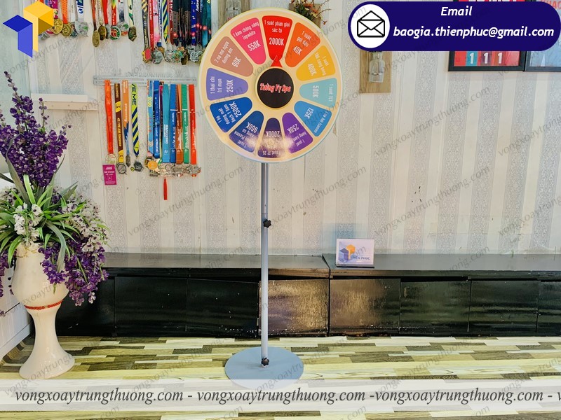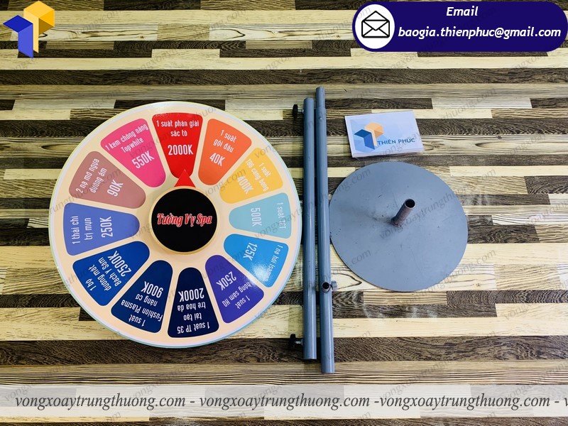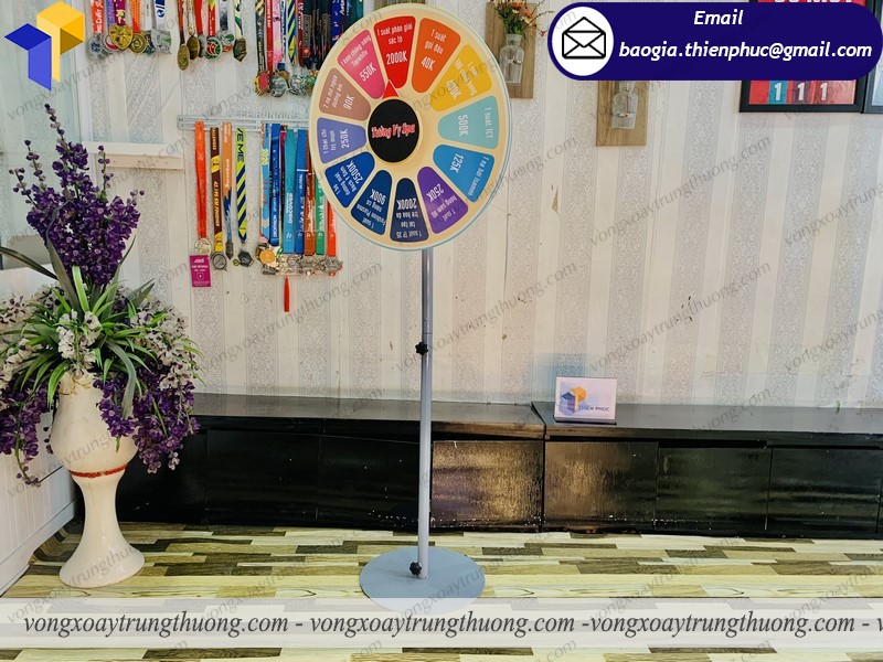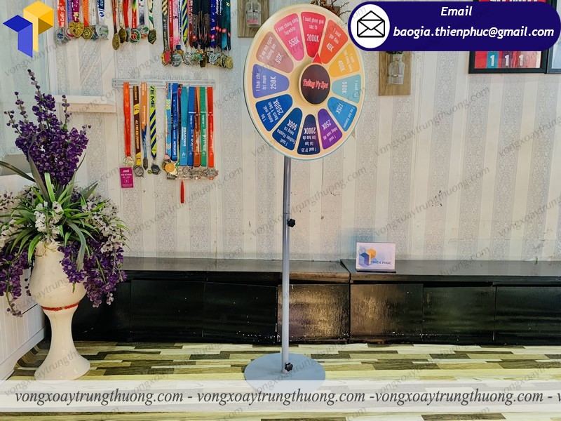 Để vòng quay thuận lợi, dễ sử dụng Thiên Phúc sử dụng vòng bi xoay. Vòng xoay trúng thưởng sự kiện chân đứng, loại này gọn nhẹ dễ tháo lắp có đường tròn 60cm, loại này có hình dáng bắt mắt,chắc chắn, dễ thu hút được người đi đường. Dù giải thưởng nhỏ hơn lớn đi chăng nữa thì hình thức này tổ chức ra chắc chắn thu hút mọi người. Để khách hàng có nhiều sự lựa chọn hơn những mẫu vòng quay may mắn trúng.