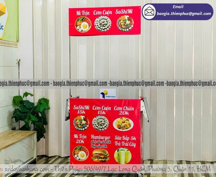 Thiết kế tương thích với nhiều phụ kiện mở rộng Mẫu xe chuẩn thường có sẵn điểm gắn thêm mái che, thanh treo phụ, ngăn kéo bổ sung hoặc giá để đồ hai tầng — giúp người bán mở rộng điểm bán theo nhu cầu mà không cần mua xe mới.