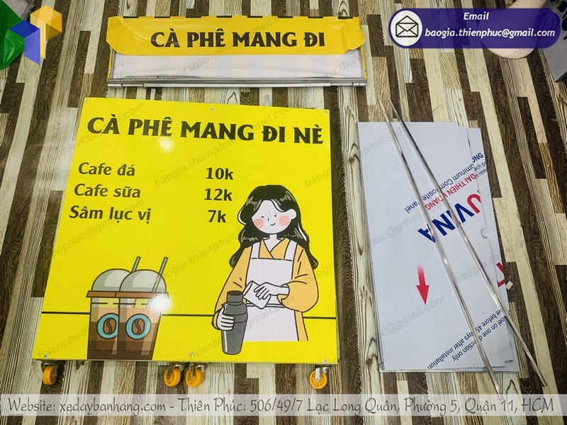 Đặc biệt, Thiên Phúc còn thiết kế riêng đề can xe bán café vỉa hè miễn phí theo ý bạn cùng sự tư vấn từ nhân viên thiết kế cho tới khi bạn có được chiếc xe đẩy ưng ý nhất.