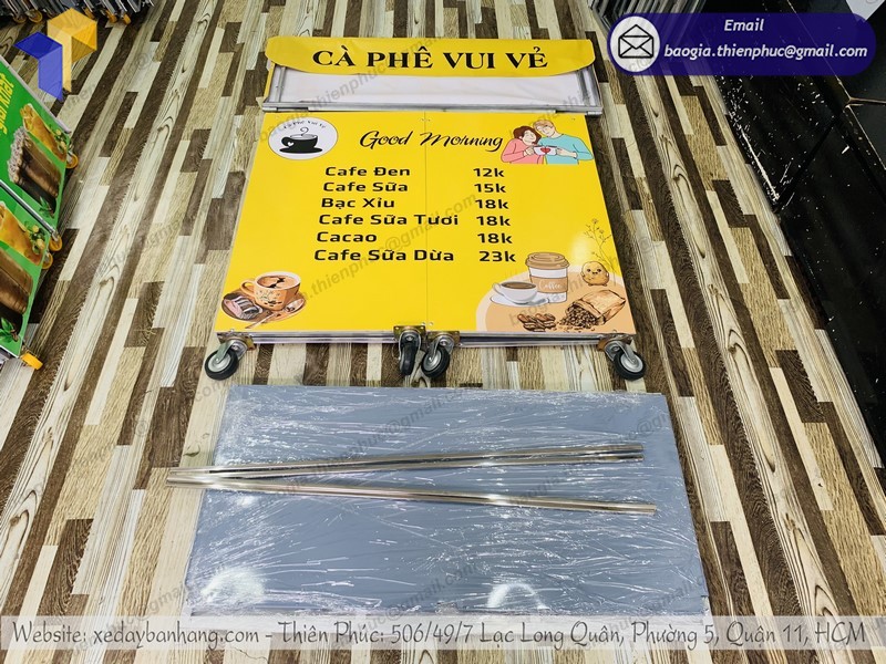 Xe xếp gọn bán cà phê 1 mét được kết hợp từ những chất liệu: khung sắt vuông, ốp tôn hoặc alu, chất liệu cao cấp hơn có thể là inox qua bàn tay sáng tạo những người thợ tại Thiên Phúc đã tạo ra những chiếc xe bán hàng khá độc đáo. Tạo sự thu hút của mọi người chú ý đến sản phẩm của bạn.