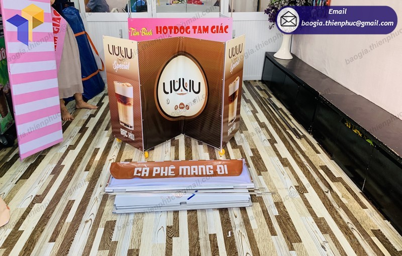 Thiết kế xe bán cà phê lắp ráp m Thiên Phúc với banner đề can nổi bật, trên đề can có đầy đủ thông tin cửa hàng, sdt, hình anh, menu, giá bán…tạo điểm nhấn, gây ấn tượng mạnh, thu hút khách mua hàng ngay từ xa. Chỉ cần đi ngang qua, nhìn thấy là đã muốn dừng lại và mua ngay. Nhờ đó, chủ cửa hàng tiết kiệm được khoản chi phí lớn thuê mặt bằng, quảng bá thương hiệu.