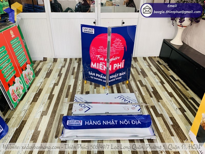 Khung xe lắp ráp bán hàng làm từ sắt vuông 20cm. Phía trong có 2 ngăn, 1 ngăn tôn và 1 ngăn sắt rỗng. Phần mái có thể làm logo bắn bạt hoặc mái bạt để tạo thêm bóng mát cho quầy. Tất cả các chi tiết sau khi gấp gọn sẽ nằm bên trong quầy để quầy trở nên gọn hơn khi di chuyển.