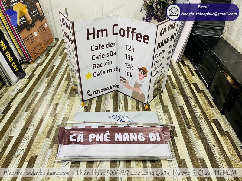 Bên cạnh xe café di động, Thiên Phúc cũng cung cấp các loại vật phẩm quảng cáo khác như vòng quay may mắn, standee quảng cáo, thùng phiếu, khay inox, dù quảng cáo,…