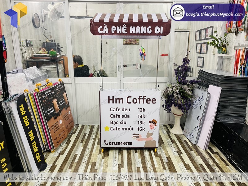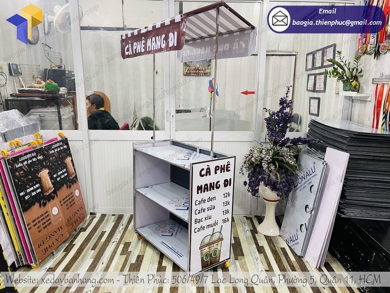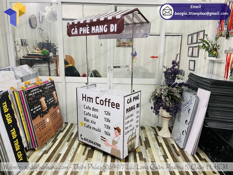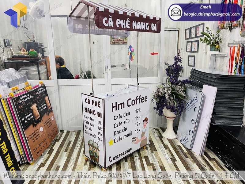 Thiên Phúc với hơn 10 năm sản xuất xe bán cafe, xe đẩy bán hàng rong là một trong những thương hiệu uy tín trên toàn quốc nơi bạn có thể mua được chiếc quầy bán hàng chất lượng tốt với mức giá rẻ nhất. Xe cà phê Thiên Phúc được làm từ 100% chất liệu cao cấp với đầy đủ kích thước từ 90cm tới 2m. Bạn có thể lựa chọn kiểu dáng, kích thước và mẫu mã hoặc thiết kế xe café mang đi theo yêu cầu.