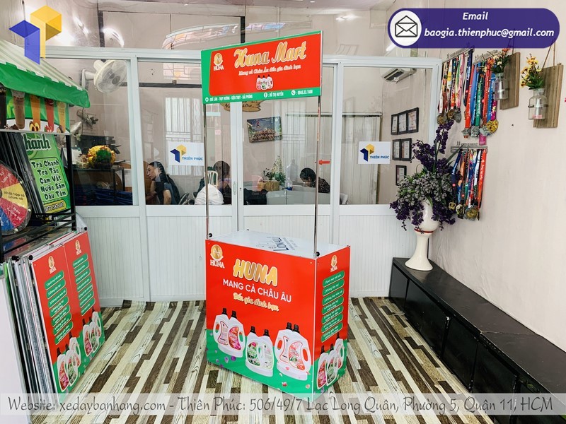 Công ty Thiên Phúc là một trong những xưởng sản xuất booth lớn nhất nhì tại Sài Gòn, chuyên nhận thi công – thiết kế trọn gói các vật phẩm quảng cáo như sản xuất booth sắt sampling giá rẻ, booth sampling quảng cáo, quầy bán hàng lắp ráp lưu động từ chất liệu nhựa, sắt, inox…