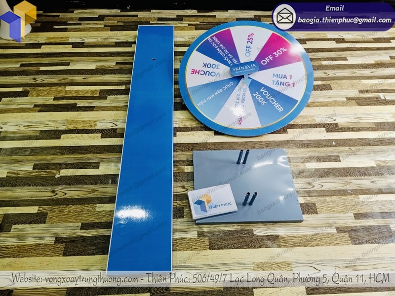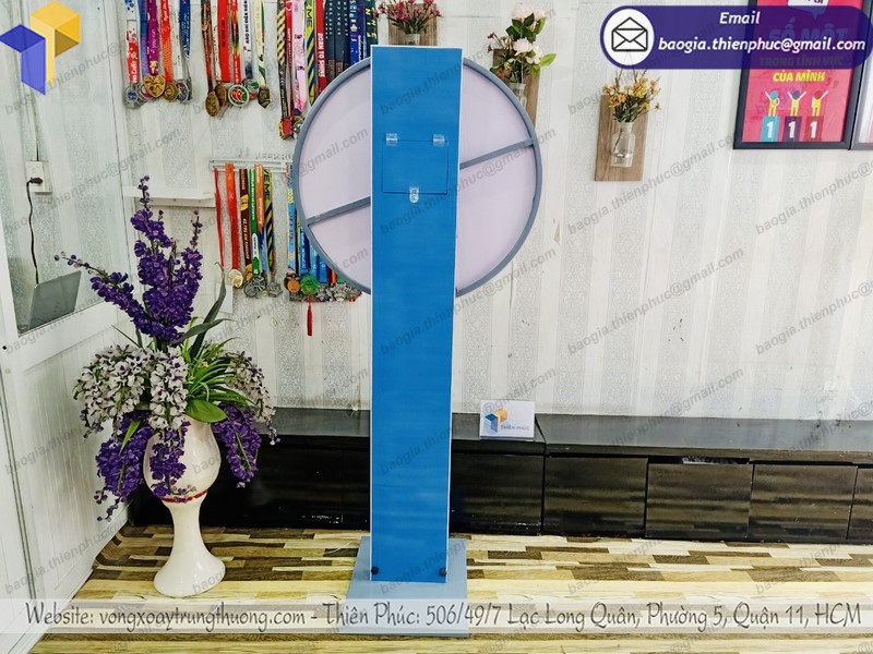 - Tại Thiên Phúc luôn có sẵn những mẫu vòng xoay trúng thưởng in logo thông dụng như vòng quay để bàn 45cm, vòng quay đứng 45cm, 60cm, 80cm, có thể giao hàng cho khách hàng trong ngày từ lúc cọc và duyệt mẫu sản xuất.