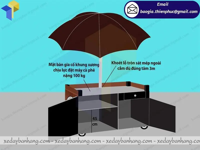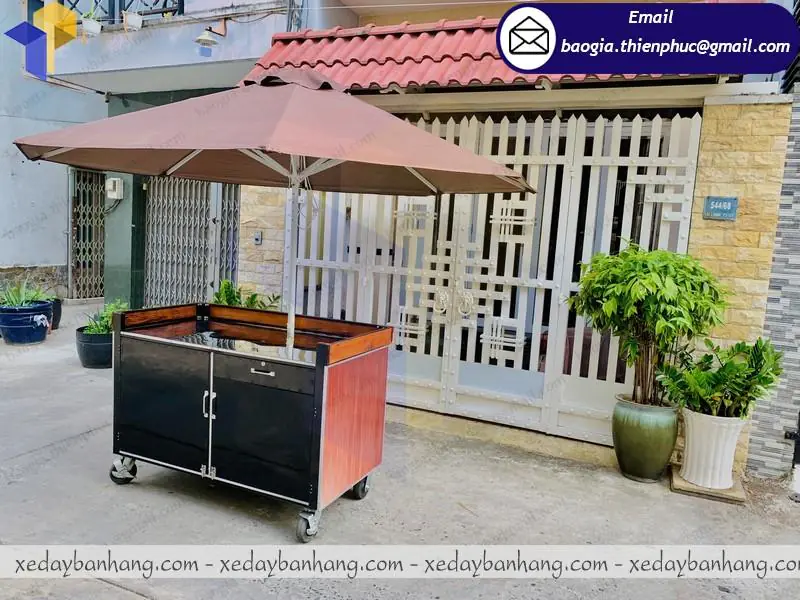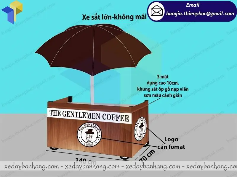 Chính vì thế, những khách hàng của Thiên Phúc đã đưa ra ý tưởng về chiếc xe sắt bán café đầy đủ tiện ích có ô che mưa độc đáo để bạn không cần phải lo khi những cơn mưa đến bất chợt nữa. Chẳng những thế, với thiết kế độc đáo chiếc xe hoàn toàn có thể thu hút toàn bộ sự chú ý của mọi người, giúp bạn dễ dàng hơn trong việc pr thương hiệu đến rộng khắp các tỉnh thành trên thành phố.