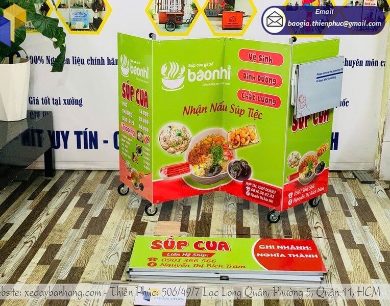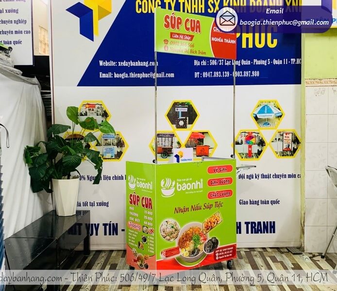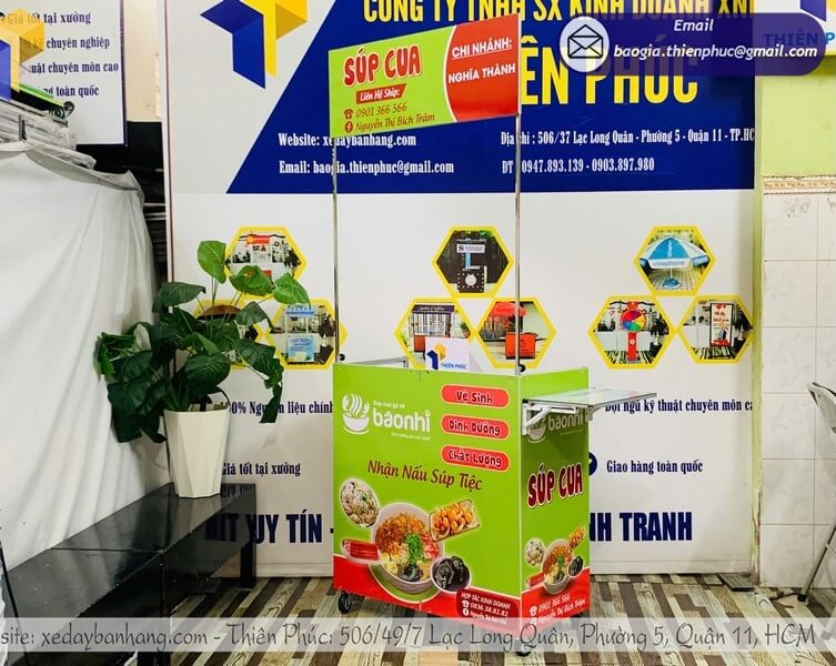 - Tối ưu không gian: xe được thiết kế gọn gàng, có ngăn chứa đồ, kệ bày sản phẩm khoa học, giúp bán hàng nhanh chóng và chuyên nghiệp.