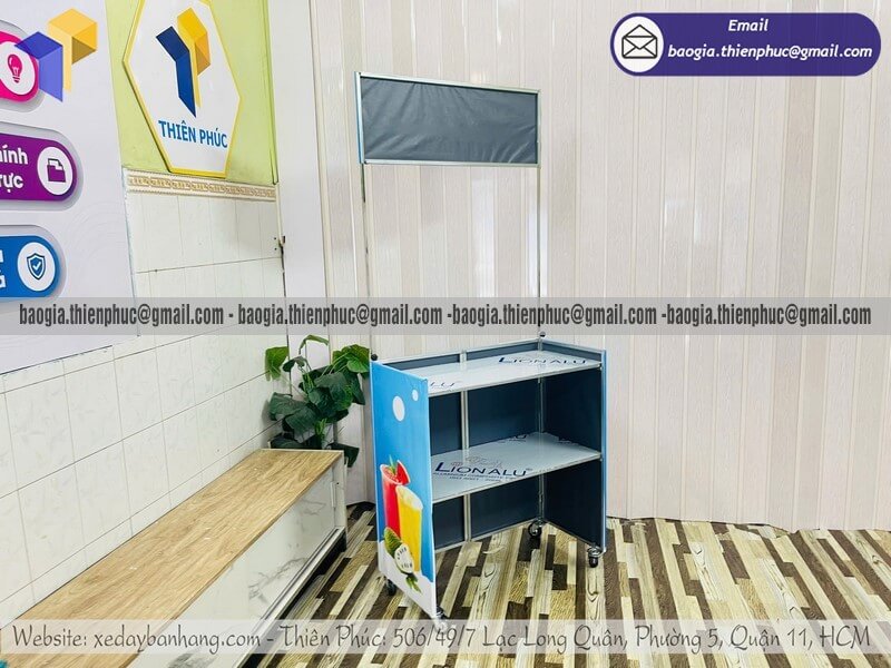 - Thêm bánh xe có khóa, dù che nắng, kệ ly, bệ xếp phụ 1 hoặc cả 2 cái, bảng menu ốp format
