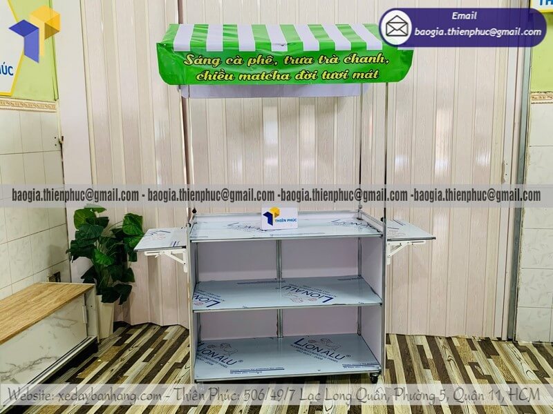 Xưởng bán quầy nước ép vỉa hè lắp ráp có mái che - Xưởng sản xuất & Công Ty Thiên Phúc là xưởng chuyên nhận đặt làm theo yêu cầu, gia công, sản xuất, thiết kế & in ấn logo thương hiệu - nhãn hiệu - menu sản phẩm quầy bán dạo gấp gọn lưu động theo yêu cầu khách hàng với hơn 10 năm kinh nghiệm, cung cấp nhiều mẫu kệ/tủ/quầy/xe bán hàng gấp gọn lưu động, chỉ cần 700.000đ/quầy trở lên với chất lượng ốp bạt đến trên 2.200.000đ/quầy trở lên sẽ có đầy đủ kệ ly, bệ xếp,... chưa kèm theo chi phí khác như menu, ô dù,... Hỗ trợ xuất hóa đơn VAT. Đặt hàng từ 10 quầy trở lên được chiết khấu cực kỳ ưu đãi. Giao hàng nhanh trên toàn quốc. Thiết kế logo hoàn toàn miễn phí.
