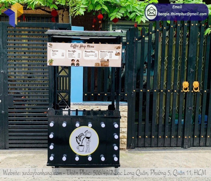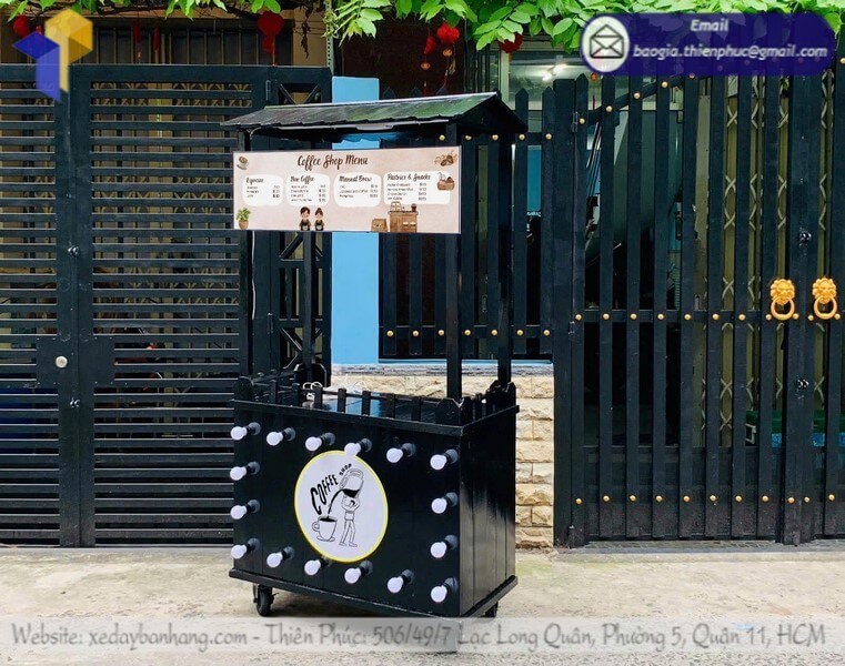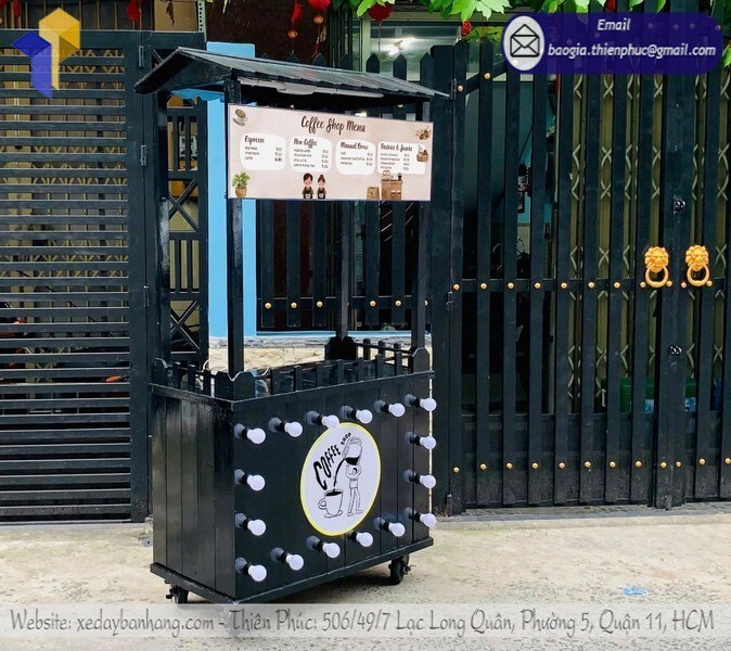 - Xe gỗ đẩy cafe cao cấp: Khung gỗ chắc chắn, có mái che chống nắng, kèm bảng menu nhỏ, thiết kế hiện đại, dễ dàng thu hút khách hàng.