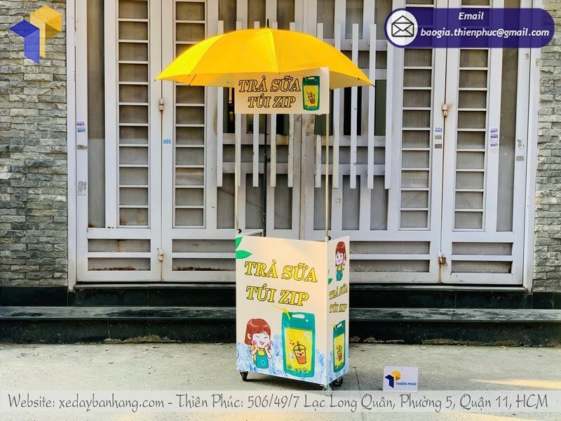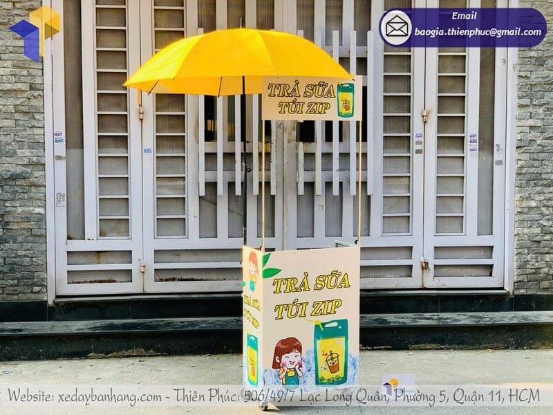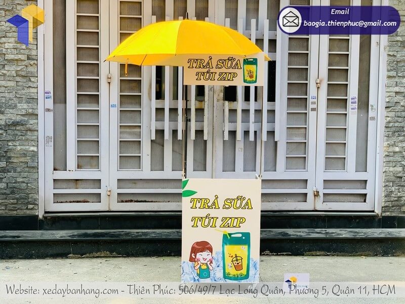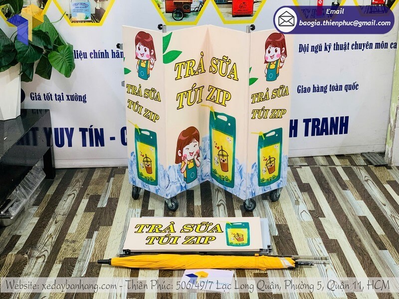Tên sản phẩm: Xưởng làm kệ bán trà sữa gấp gọn ngoài trời có dù che có logo nhãn hiệu bảng ngang TRÀ SỮA TÚI ZIP