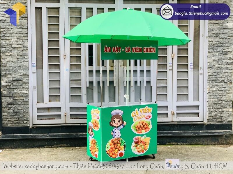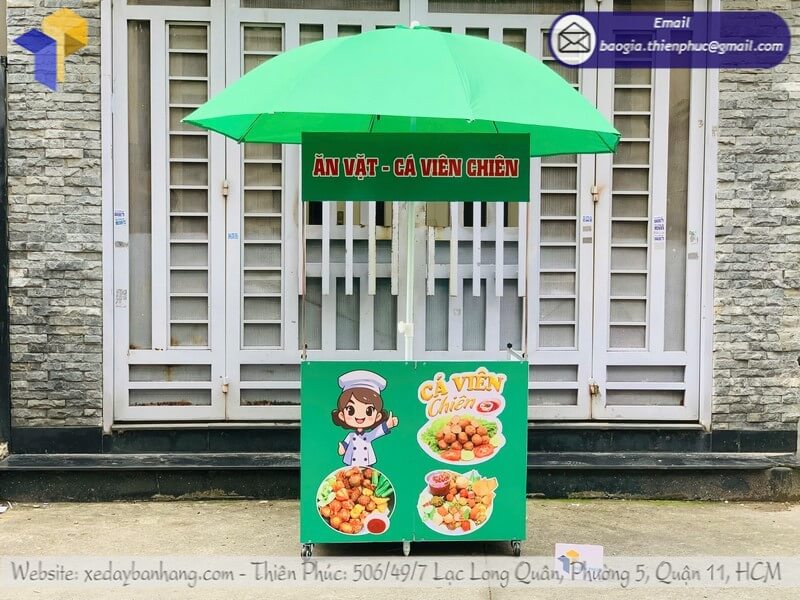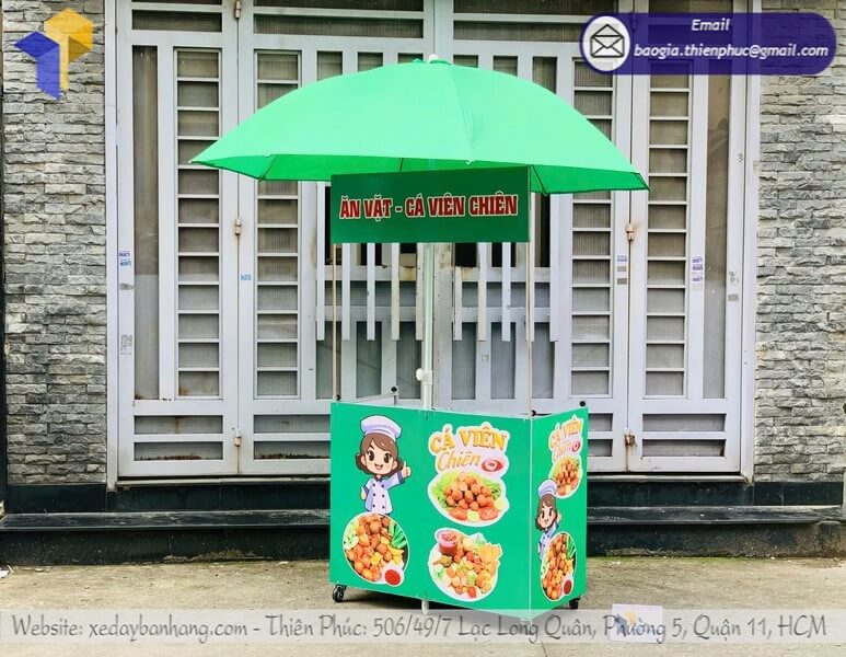 Tên sản phẩm: Xưởng làm quầy bán đồ ăn vặt dạo xếp gọn có dù che có logo ĂN VẶT - CÁ VIÊN CHIÊN
