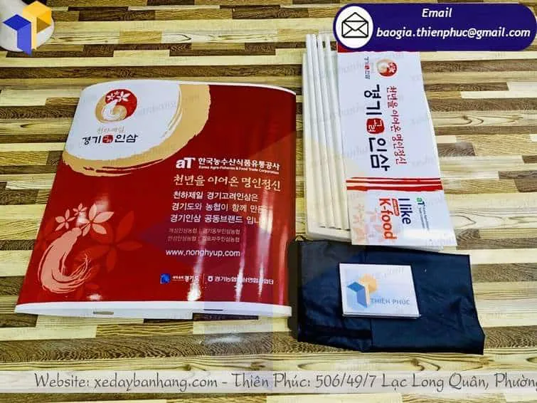 + Phần tấm logo phía trên là 0.3×0.8m chất liệu decal ngoài trời, cắt sát để cán bồi lên bề mặt bàn và tấm logo