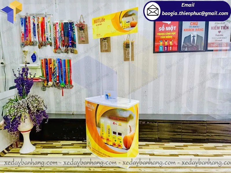 Quầy bán hàng lưu động bằng nhựa được thiết kế ngày càng hiện đại mang phong cách năng động trẻ trung, và ngày nay nó thực sự trở nên hữu ích với nhiều doanh nghiệp cũng như tổ chức và đặc biệt hơn hết là các nhãn hiệu của nhiều công ty quảng cáo được in ấn trên quầy hàng này. Chất liệu 100% nhựa dẻo thiết kế tháo lắp ráp gọn gàng, nhanh chóng, chuyên dùng để trưng bày tại các siêu thị, trung tâm thương mại hoặc ngay các vỉa hè hoặc các gian hàng hội chợ triển lãm…