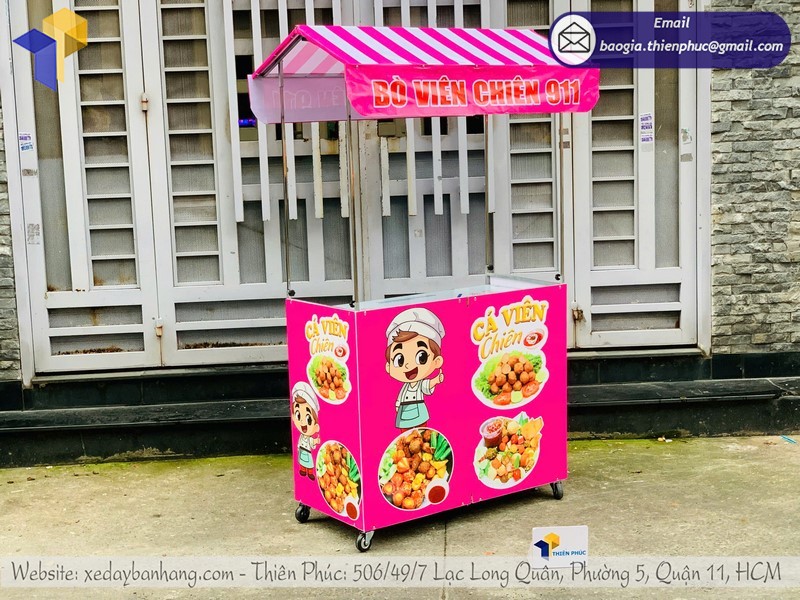 - Mẫu quầy bán cá viên chiên có mái che, chống nắng hiệu quả.