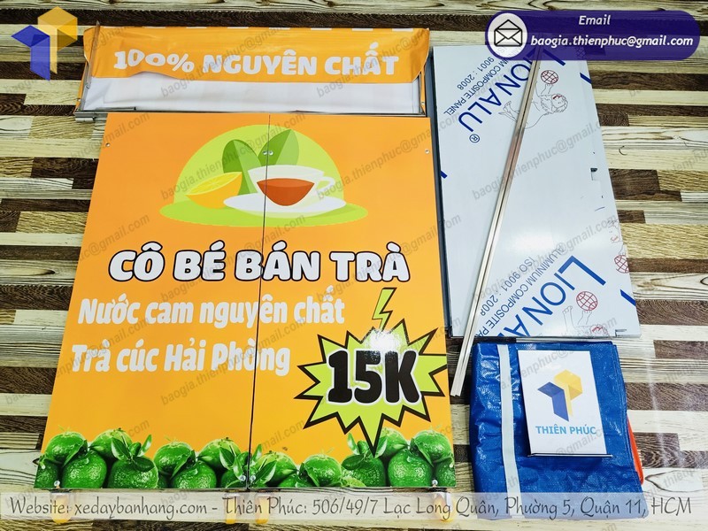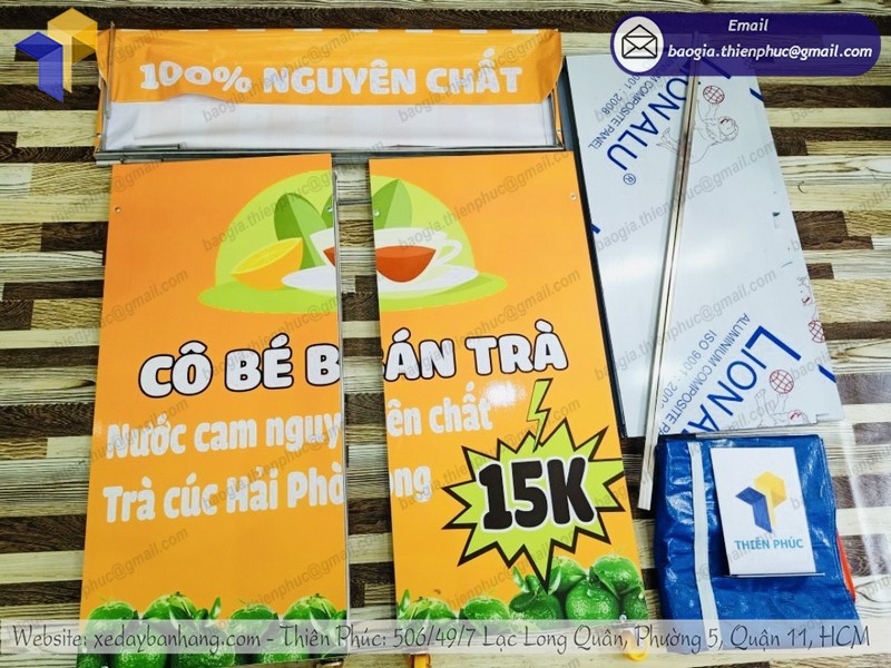 - Phần hình ảnh xe lắp ráp bán nước cam được gia công từ chất liệu decal cán format 5mm. Chất liệu decal cán bóng hoặc cán mờ theo yêu cầu. Vì chất liệu decal chuyên được sử dụng ngoài trời nên không lo nắng mưa hay bong tróc. Đảm bảo độ bền màu, sáng bóng và sắc nét về mặt hình ảnh. Chất liệu format chuyên dụng dùng trong quảng cáo sẽ giúp quầy thêm thẩm mỹ.