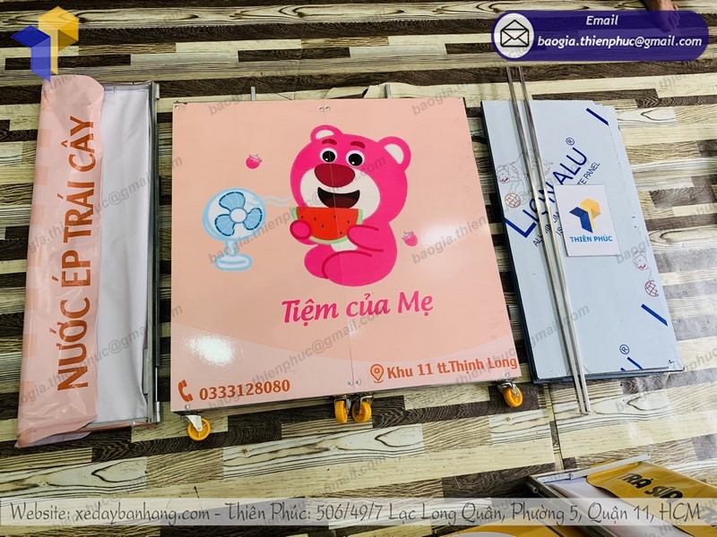 - Phần hình ảnh xe lắp ráp bán nước ép trái cây giá rẻ được gia công từ chất liệu decal cán format 5mm. Chất liệu decal cán bóng hoặc cán mờ theo yêu cầu. Vì chất liệu decal chuyên được sử dụng ngoài trời nên không lo nắng mưa hay bong tróc. Đảm bảo độ bền màu, sáng bóng và sắc nét về mặt hình ảnh. Chất liệu format chuyên dụng dùng trong quảng cáo sẽ giúp quầy thêm thẩm mỹ.