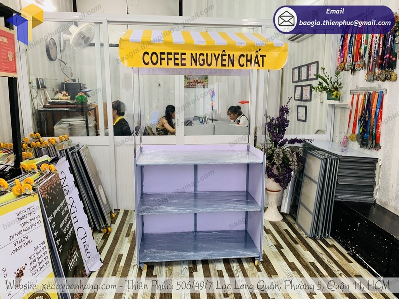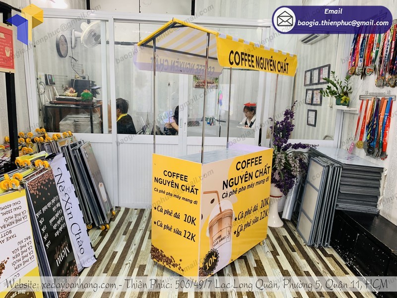 Công ty thiết kế và gia công Thiên Phúc là một trong những địa chỉ chuyên sản xuất và phân phối tủ (xe) bán cà phê tiện lợi, uy tín nhất định bạn không thể bỏ qua. Với hơn 10 năm kinh nghiệm trong lĩnh vực gia công xe đẩy bán hàng. Ở tất cả các lĩnh vực như xe bán trà sữa; xe bán sinh tố; xe bán trái cây; hoặc thậm chí các sản phẩm, cửa hàng thực phẩm, thức ăn và thức uống. Kể cả là các xe bán cà phê mang đi hay tủ cà phê lưu động. Các sản phẩm gia công phân phối tại Thiên Phúc luôn được người tiêu dùng đánh giá cao: