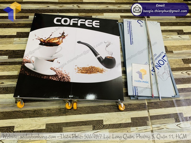 Để quá trình vận chuyển và di chuyển thuận tiện, chủ động trong vấn đề tiếp cận khách hàng tiềm năng. Quầy bán cafe lắp ráp trang bị hệ thống bánh xe 4 bánh kèm khóa chốt an toàn. Giúp người dùng vừa có thể di chuyển xe; vừa có thể cố định khi bán hàng.